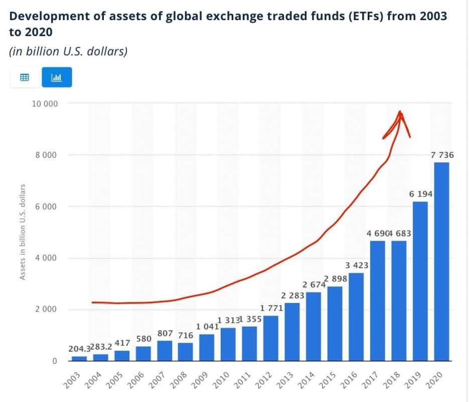Tra i commenti il grafico dell’evoluzione delle masse degli ETF dal 2003.