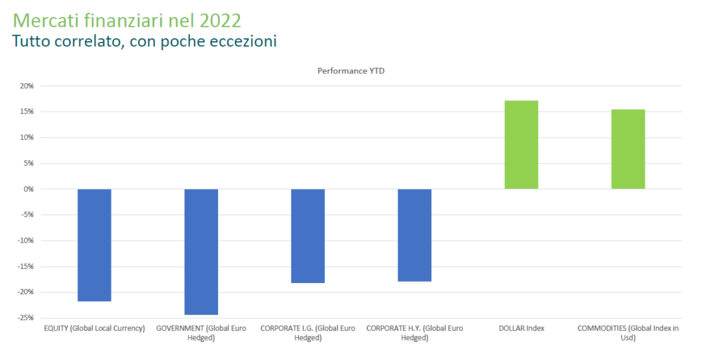 Si sono concatenate diverse circostanze (inflazione, politiche restrittive delle banche centrali, incertezza derivante dalla guerra, brusco rallentamento della Cina, spauracchio della recessione, etc. โฆ) che hanno portato contestualmente alla perdita sia del mercato azionario che obbligazionario.